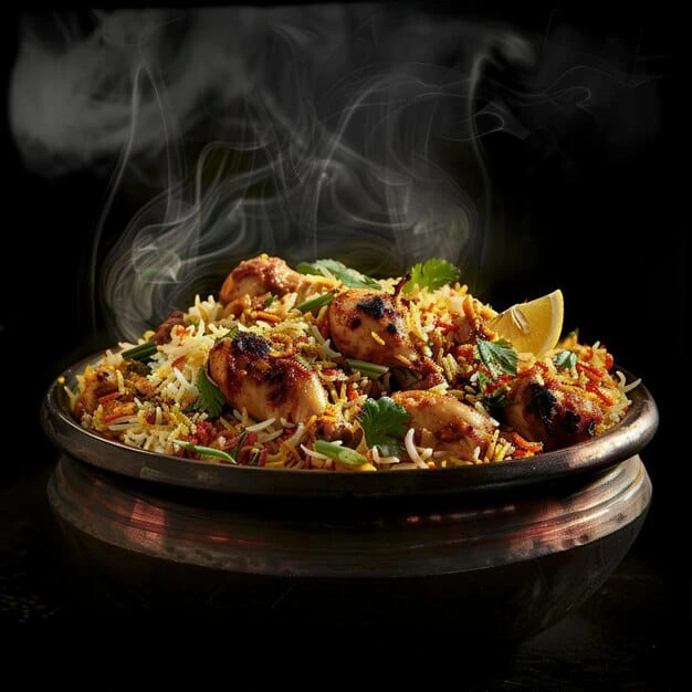 Hyderabad biryani (also known as Hyderabad dum biryani) originated from Golconda, Telangana India, made with basmati rice and meat Originating in the kitchens of the Qutub Shahi Kingdom. It combines the elements of Hyderabad and later on the Great Mughalai Cuisines. Hyderabad biryani is a key dish flourished During the period of the 6th Nizam of Hyderabad Sir Mir Mehboob Ali Khan Asaf Jah and it is so famous that the dish is considered synonymouswith the city of Hyderabad.